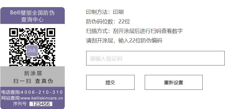 壁丽产品的防伪标签如图所示:支持电话、网站与公众号查询真伪三种方式。消费者可以刮开防伪标签上的防伪涂层,通过拨打防伪标签上的查询电话,根据语音提示输入防伪码查询真伪。也可以通过登录BELLI网站,如图例,输入22位防伪码识别真假。还可以扫描防伪标签上的二维码,关注其公众号,在菜单里即可查询真伪。
